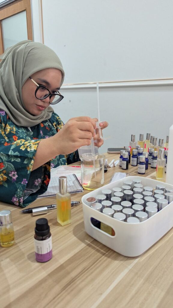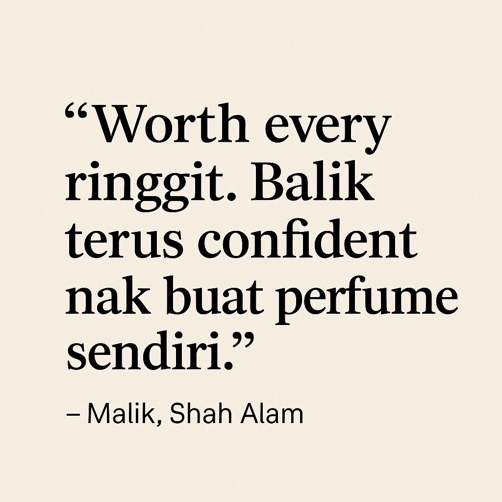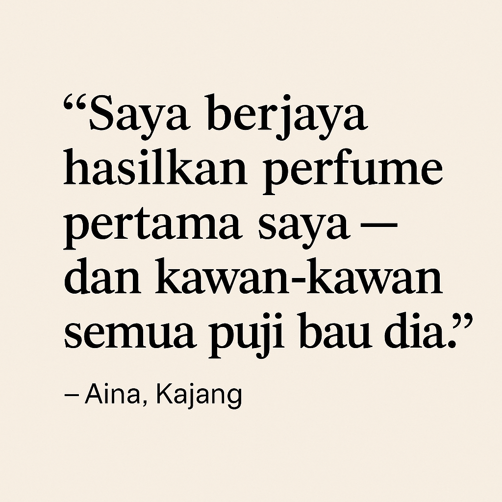 Dari asas sehingga menghasilkan perfume bau sendiri. Bawa pulang perfume ciptaan sendiri, manual lengkap, formula, dan sijil penyertaan.