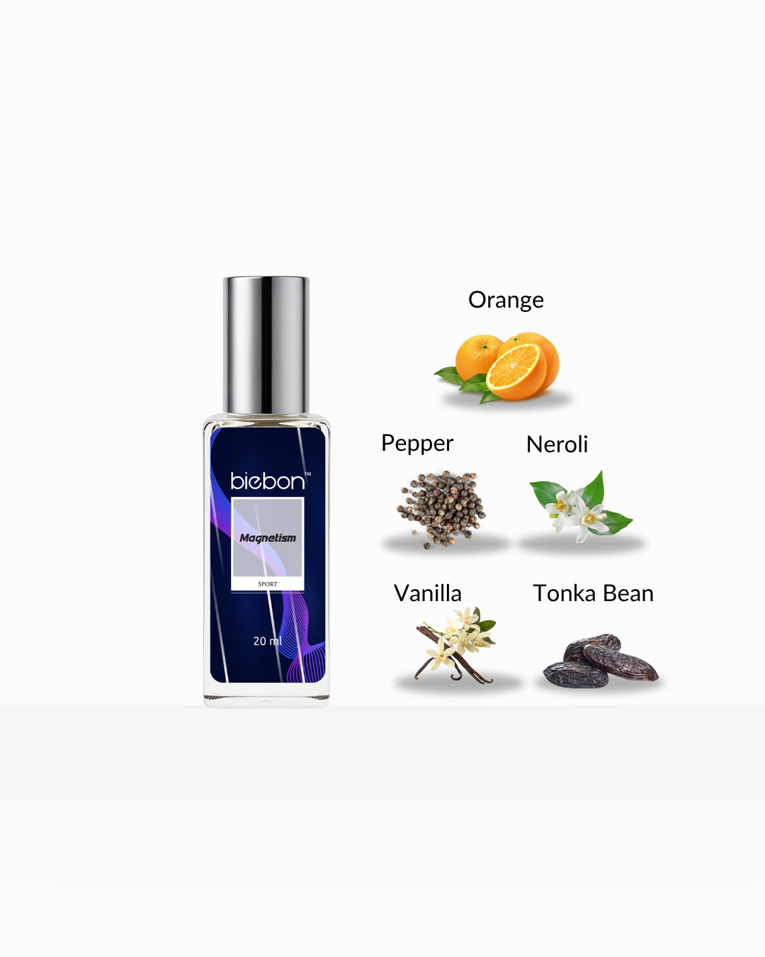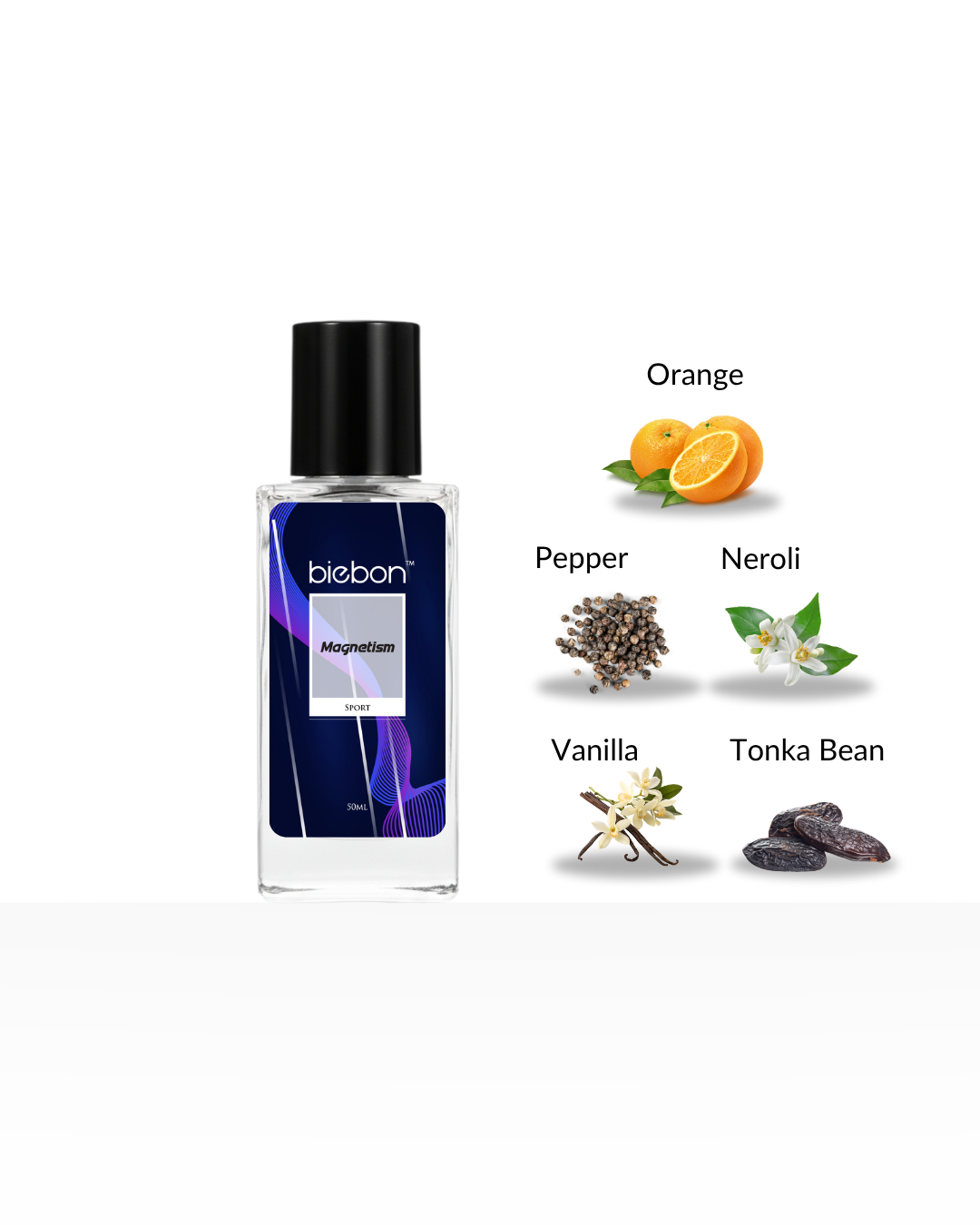 Biebon Magnetism is a powerful yet refined fragrance that embodies confidence, vitality, and timeless masculinity. It opens with a refreshing burst of mandarin orange and sea notes, creating an invigorating and energetic first impression. The heart blends pepper and neroli, adding a modern spice and clean sophistication, while the base of tonka bean, amber, and cedarwood delivers warmth, depth, and a magnetic sensuality that lingers effortlessly.