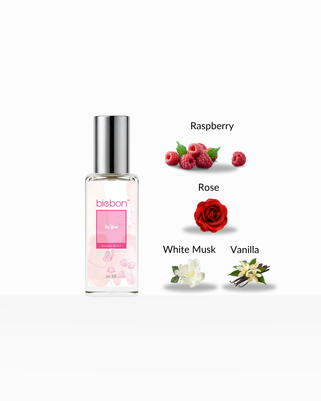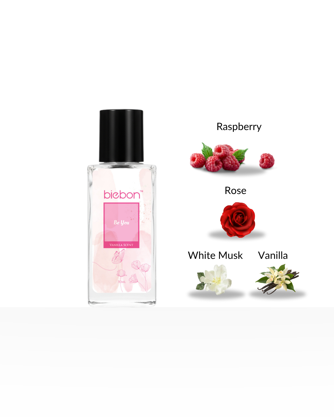 “Biebon Be You is a fragrance that embodies the joy of self-expression and the beauty of being true to yourself. The opening notes of raspberry and bergamot create a lively, fruity introduction, while the heart of rose and lily of the valley unfolds into a soft, romantic bouquet. As the scent evolves, the base notes of vanilla, musk, and amberwood create a warm, addictive finish that lingers on the skin, leaving a trail of confidence and charm. Perfect for both daytime and evening wear, this fragrance is a celebration of individuality and positivity.”