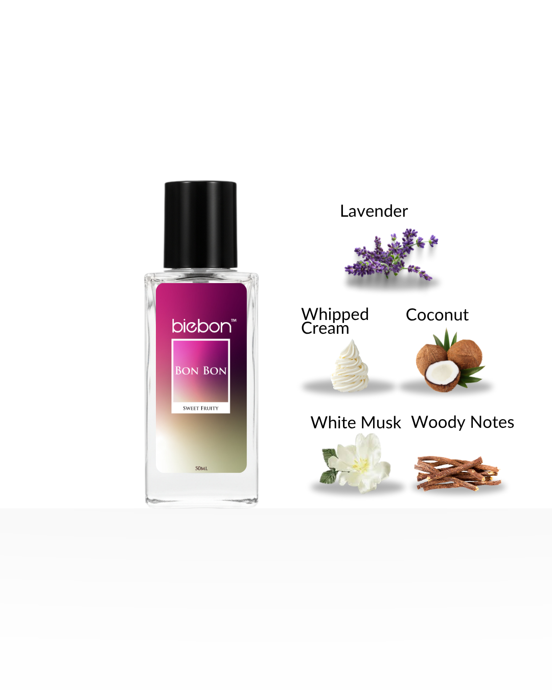 “Biebon Bon Bon is a fragrance that feels like a warm hug and a sweet escape all at once. The opening notes of lavender and pear create a fresh, fruity introduction, while the heart of whipped cream, coconut, and praline unfolds into a delicious, dessert-like bouquet. As the scent settles, the base notes of vanilla, musk, and woody accords create a smooth, addictive finish that is both comforting and captivating. Perfect for everyday wear or special moments, this fragrance is a celebration of joy, sweetness, and lightheartedness.”