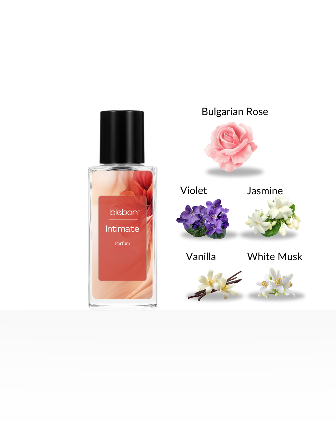 Biebon Intimate is a soft, poetic fragrance that captures the beauty of simplicity. It opens with a gentle blend of floral and powdery notes, led by jasmine and a whisper of rose, evoking the feeling of fresh petals in morning light. Subtle hints of white musk and vanilla add warmth and comfort, creating an aura that feels tender, graceful, and effortlessly elegant.