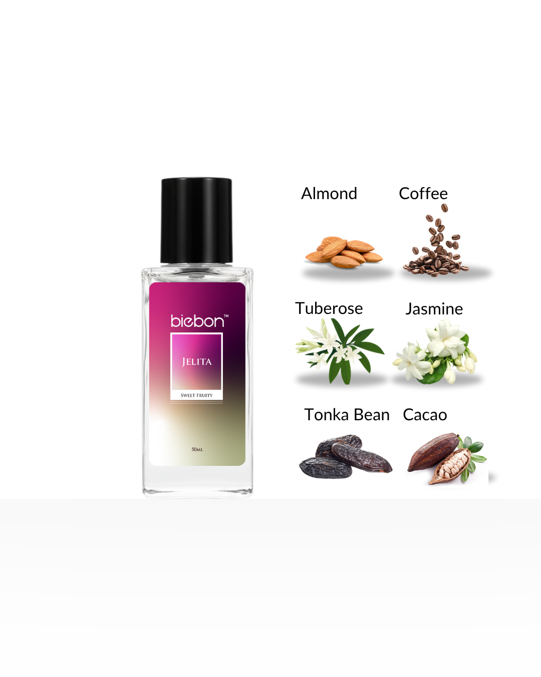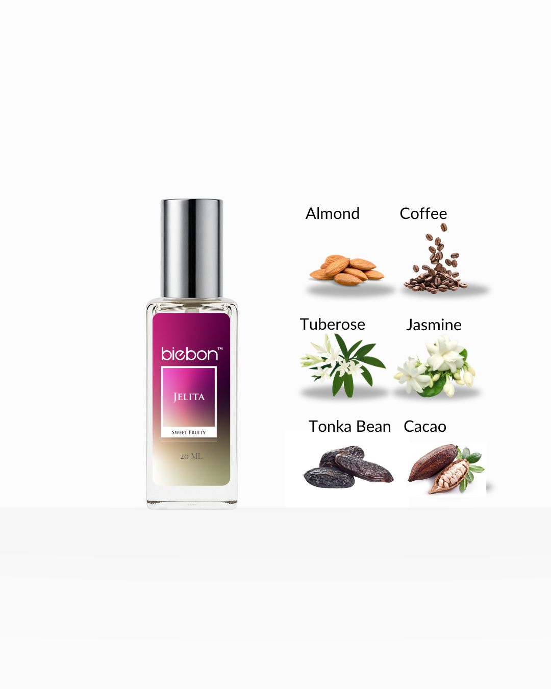 Biebon Jelita is the perfect harmony of elegance and confidence — a fragrance that celebrates the duality of a woman who is both sweet and strong. It opens with a captivating blend of sweet jasmine and cocoa, wrapped in a touch of tonka bean for a warm, addictive allure. The scent deepens with coffee and almond, giving it a modern, empowering edge that lingers beautifully on the skin.
