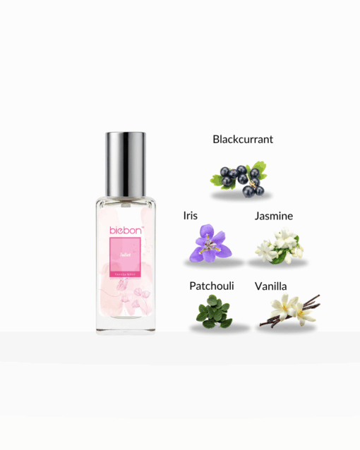 Biebon Juliet is a celebration of happiness, elegance, and timeless femininity. It opens with a luminous blend of pear and blackcurrant, creating a sweet yet refined freshness. The heart unfolds into an exquisite bouquet of iris, jasmine, and orange blossom, embodying grace and charm. Finally, the base of praline, vanilla, and patchouli adds warmth and sensual depth, leaving an unforgettable trail of joy and sophistication.