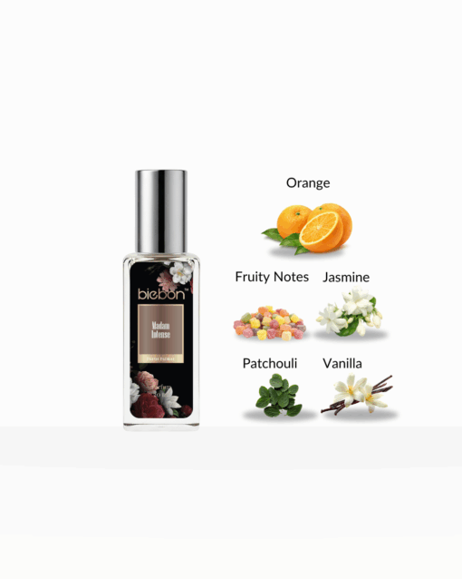 Biebon Madam Intense is the essence of modern sophistication — bold, elegant, and irresistibly refined. It opens with a radiant blend of orange, bergamot, and rose, delivering a sparkling yet graceful introduction. At its heart, jasmine and patchouli create a sensual depth that perfectly balances freshness and warmth. The base of vanilla, tonka bean, and musk lingers beautifully, enveloping the skin in a luxurious and confident aura.